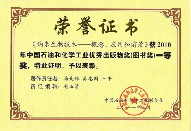 2011年7月,由生化室马光辉、苏志国、王平三位研究员主译的《纳米生物技术——概念、应用和前景》一书荣获2010年中国石油和化学工业优秀出版物奖(图书奖)一等奖。下图为荣誉证书。