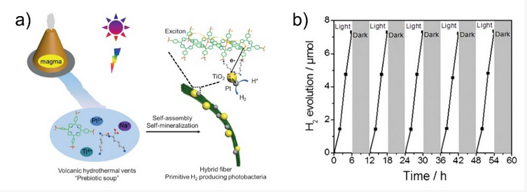 在国家自然科学基金委、中组部和中科院的大力支持下,中科院过程工程所的闫学海研究员团队在基于生物分子组装的仿生光合成和抗肿瘤治疗方面取得系列进展。研究人员受天然蛋白质调控色素分子自组装的启发,提出了寡肽调控卟啉自组装构建仿生功能体系的策略。通过对寡肽亲疏水性的合理设计,实现了分子、纳米和微米尺度有序自组装结构的构建,获得的长程有序自组装纤维束具有光学各向异性、手性放大、大斯托克斯位移、增强的光稳定性和光催化活性等特性(Angew. Chem. Int. Ed. 2015, 54, 500–505)。进一步研究表明,这种寡肽调控卟啉自组装的过程在模拟火山热液的环境中能够高效地进行,获得的多尺度组装结构在酸性、高温和高盐的条件下稳定,并且能够通过原位矿化整合二氧化钛和铂纳米颗粒。杂化组装体中卟啉和纳米颗粒的有序排布与绿色硫细菌中绿色体和反应中心蛋白的组织形式类似,实现了在苛刻条件下的光催化产氢(Angew. Chem. Int. Ed. 2016, 55, 12503–12507,图1)。因此,肽调控卟啉自组装的多尺度有序结构一定程度上模拟了生物光合成系统,为研究原始光合成系统的形成提供了参考,并对仿生生物能源体系的构建具有重要指导意义(Adv. Mater. 2016, 28, 1031–1043)。