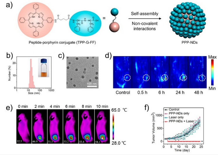 图2 基于肽-卟啉自组装的光热纳米点(PPP-NDs):a) 分子结构和自组装示意图;b) 粒径分布图;c) 透射电子显微镜图;d) 纳米点小鼠体内光声成像图;e) 纳米点用于光热治疗时小鼠热成像图;f) 纳米点用于光热治疗时小鼠肿瘤生长曲线