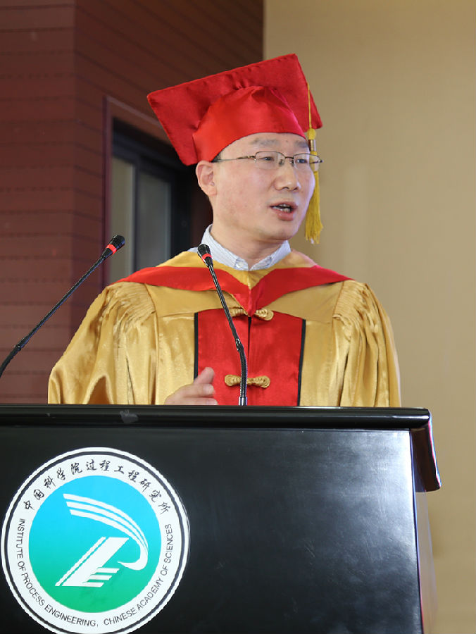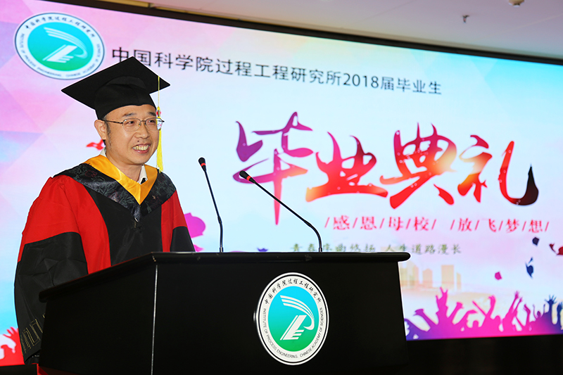 张锁江所长谈到,毕业典礼对于毕业生来说是一个非常重要的不可或缺的环节,全所高度重视,强调全所上下通力合作为毕业生的过程所生活画上一个圆满句号。他深情表达了对日夜操劳的家长的感谢,对传道授业解惑的导师的感谢,对艰苦奋斗、自强不息,为过程所基础应用研究及可持续发展贡献宝贵青春年华的毕业生的感谢,情真意切,博得阵阵掌声。他以数据说话,回顾了过程所在科研项目、人才队伍、科研平台等方面目前取得的骄人成绩;在党的十九大新思想、新机遇、新要求下提出了新的发展目标,着力把过程所建设成高精尖人才汇聚的国际化新型研究所。最后,张锁江所长对毕业生提出了殷切期望及建议:一是一定要树立正确的世界观、价值观、人生观,要有远大的理想。习近平总书记在十九大报告中强调“青年是祖国的前途、民族的希望、创新的未来”,理想是人们向往和追求的奋斗目标,所以大家要要志存高远、脚踏实地,不能急功近利; 二是一定要有责任感,要谦虚不断地学习。学习是进步的有力方式,希望大家多学习历史、哲学,多到企业中、实践中学习,多向国际大师学习,同时认识到建立良好的学术生态的重要性;三是一定要注意身心健康,注重家庭和谐。毛泽东主席有句名言“身体是革命的本钱”,健康的体魄,再加上积极、乐观的心态,是成大事的一个前提条件。古人曾云“父之笃,兄弟睦,夫妻和,家之肥也”,希望大家在努力工作的同时,更要维护好家庭关系。最后,希望同学们永远乐观向上,期待以后再相聚。