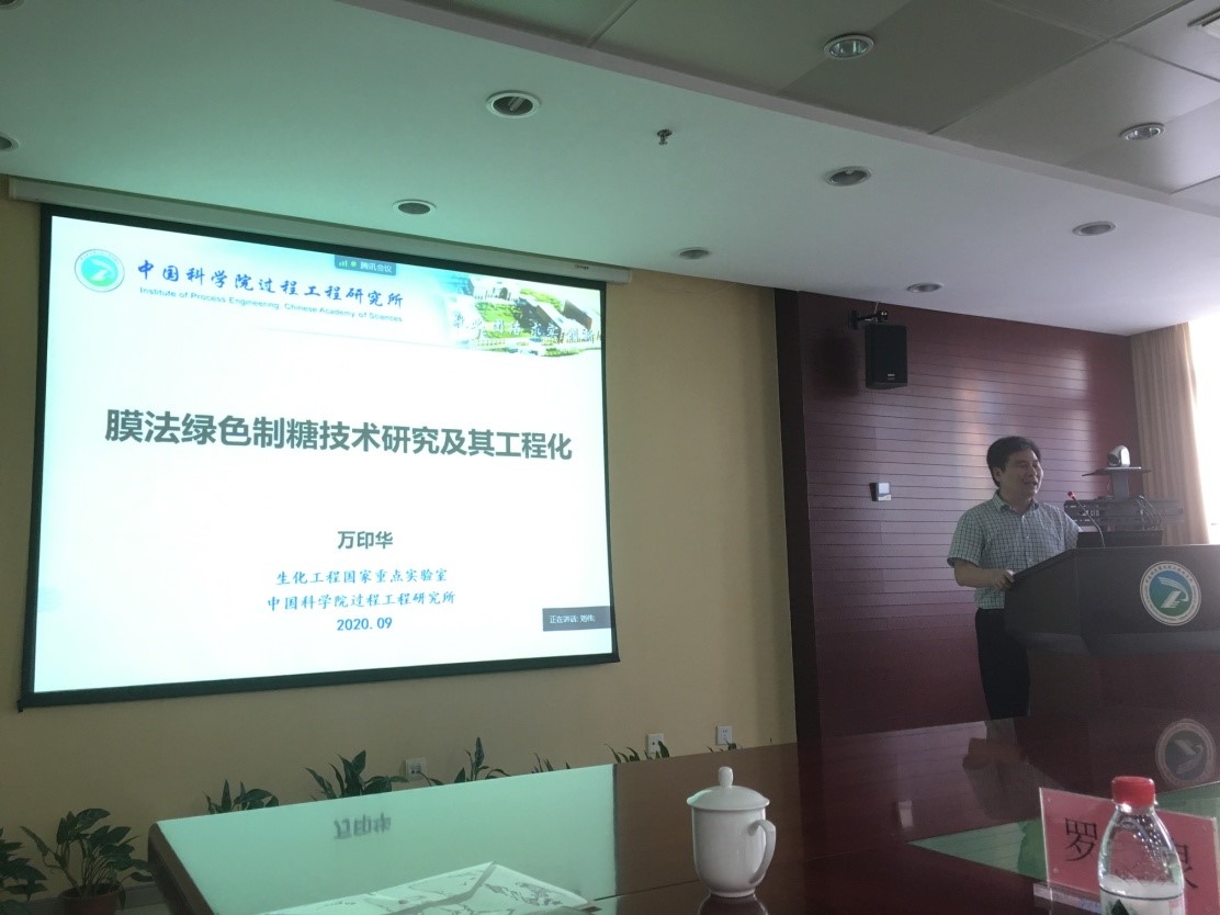 9月22日,生化室协助中科院老科协过程工程研究所分会通过现场与网络相结合的方式,举办了“先进膜技术与传统产业技术升级”学术沙龙。分会常务副理事长、生化工程国家重点实验室苏志国研究员主持了活动,生化室副主任万印华研究员作了“膜法绿色制糖技术研究及其工程化”主旨报告。中科院老科协领导桂文庄、何远光莅临指导,过程工程所副所长、分会理事长管兵致辞。与会的领导、专家学者及研究生40余名。