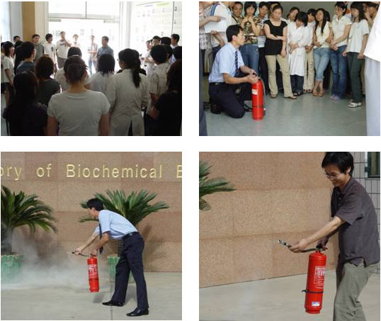 为了加强生化室师生的防火意识和应急能力,生化室于5月30日下午四点在生化楼大厅举行了一场消防安全讲座并现场教学灭火器的使用。首先保卫处的洪守坤老师为大家简单讲述了火灾易发原因和火灾发生后应如何应对。然后由我所物业的胡乐东主管详细专业的介绍了火灾发生后的处理措施,他告戒大家在火灾发生之后不要惊慌,如果火势较小可用湿布捂灭,或者使用灭火器进行扑灭,尽量不要用水泼;如果火势无法控制,应先通知附近人员并逃离,并将火情迅速报告物业交由保安处理。最后,胡主管给大家现场示范了灭火器的使用,并有部分同学亲手使用了灭火器。 通过这次讲座,不仅提醒大家在实验过程中应尽量避免火灾隐患,而且也加强了大家在应对火灾时的处理自救能力,获得了良好的效果。 |