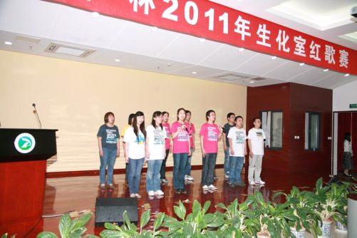 2011年5月6日,由生化职工支部、生化工会和生化学生支部联合主办的“盛华杯”红歌赛在过程所多功能厅拉开帷幕,十五支代表队共五十多名参赛选手参加了比赛。经过激烈角逐和加赛,最终由徐建、张欣、余景开、徐霞等百人联合代表队获得大赛一等奖,马光辉课题组代表队获二等奖,邢建民课题组代表队获三等奖,所有参赛队均获参与奖。下图为参赛代表歌唱的照片。