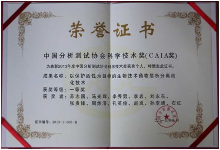 2013年度中国分析测试协会科学技术奖于近日揭晓,过程工程所生化工程国家重点实验室苏志国、马光辉、李秀男等人完成的“以保护活性为目标的生物技术药物层析分离纯化技术”获得一等奖。这是今年本所获中国石油化学工业联合会的科学技术奖后,摘得的又一国家级学会的奖项。 中国分析测试协会科学技术奖设立于1993年,是国家承认的全国性学会科学技术奖,用于表彰在分析测试新技术、新方法及新应用等方面取得突出成果贡献、创造显著社会、经济效益的科技工作者和组织。其中一等奖要求成果具有国际先进水平或显著的社会经济效益。 “以保护活性为目标的生物技术药物层析分离纯化技术”针对生物技术药物分析和分离中出现的产物失活现象,研究其影响分析和分离精度、降低产物收率和产生大量新杂质的规律,探索产物失活的原因,在国际上报道了具有代表性的超大生物大分子失活机理,提出了生物技术药物层析分离纯化中保护产物活性的新策略,并发展了活性分子伴侣、可控层析介质和组合层析等创新技术。相关研究成果共发表SCI论文31篇,获得授权专利13项,成果被国内外同行引用并已应用于相关制药公司生物技术药物的生产和质控中,取得了显著的社会经济效益,在生物技术新药的开发中具有重要的应用前景。 (科技开发处生化工程国家重点实验室) |
