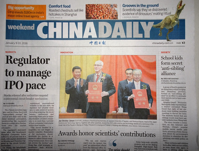 生化室国际合作专家、瑞典乌普萨拉大学Jan-Christer Janson教授获得了2015年中华人民共和国国际科技合作奖。颁奖大会于1月8日上午在人民大会堂隆重举行,Jan-Christer Janson教授出席了颁奖仪式,受到国家领导人的接见。此次共有7位外国科学家获得该奖励。