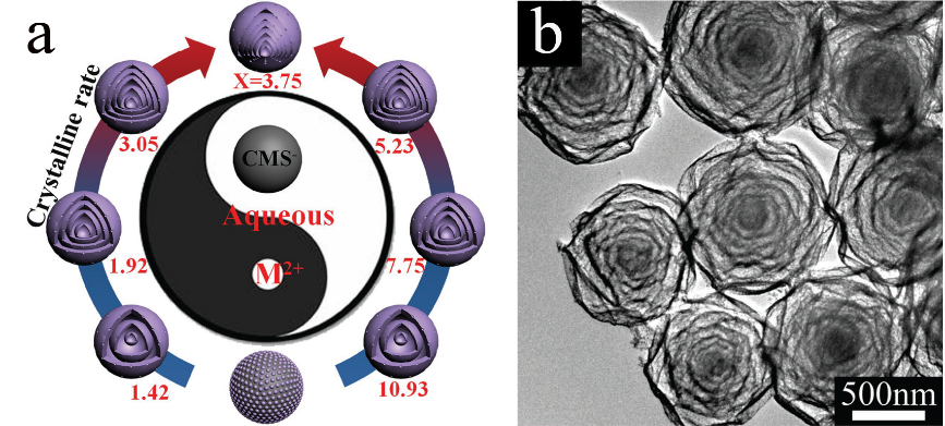 图1. (a) 不同Co/Mn比对晶化速率和产物结构的影响示意图; (b) 七壳层(Co2/3Mn1/3)(Co5/6Mn1/6)2O4空心球的透射电镜照片