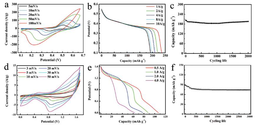 (c) 循环寿命曲线; 碱性二次电池体系的 (d) 循环伏安曲线, (e) 恒流充放电电压曲线, (f) 循环寿命曲线