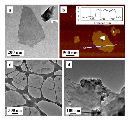 b) 少层石墨炔纳米片的AFM照片(插图显示厚度约为1.1nm); c) MoS2纳米片的TEM照片; d) 氧化石墨烯的TEM 照片.