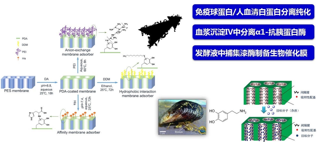 中科院过程工程研究所万印华研究员课题组提出采用简单易操作的聚多巴胺(PDA)涂覆对机械强度较高的聚醚砜(PES)和聚偏氟乙烯(PVDF)微滤膜进行活化,然后以PDA 为中间功能层偶联膜色谱配基(迈克尔加成反应或席夫碱反应)构建多种膜色谱介质,并应用于蛋白分离纯化和酶的固定化。