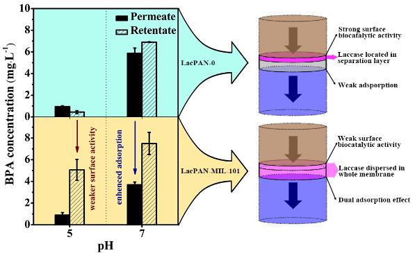 生活用水及再生水中常含有微量、难降解、高危害的小分子有机污染物,主要来源于药物及个人护理品(抗生素、消炎药、激素和农药)和工业污染物(多环芳烃、双酚A、多氯联苯等)。有证据表明,这类微污染物可能诱发人类性早熟、癌症、畸形以及造成牲畜大量死亡。因其分子量普遍较小(100-1000 Da)且吸附性强,即使是纳滤或反渗透膜都难以对其完全截留。应运而生的酶基生物催化纳滤膜集成了酶降解和膜分离功能,可显著提高纳滤膜对污染物的去除能力,作为代价,酶的堵孔效应使纳滤膜渗透性大幅下降。另一类生物催化微滤膜虽具有高载酶量、高通量和高去除率,但本身过滤能力不够精细,且易污染。综上,如何制备稳定且高效的生物催化膜是一项艰巨的挑战。