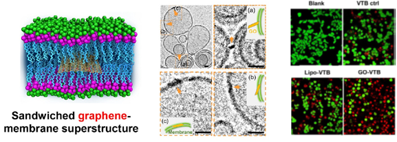 (Left): Graphic illustration; (middle) cryo-TEM experimental evidence; and (right) superior drug delivery efficacy (GO-VTB) of the sandwiched graphene-membrane superstructure.