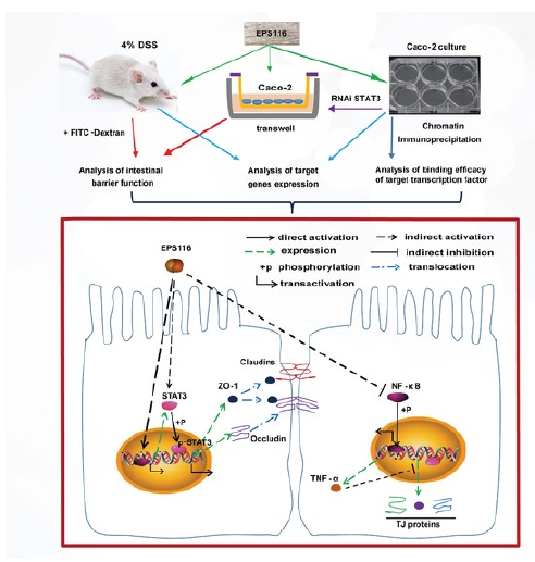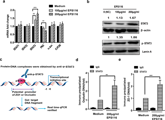 此外,染色质免疫沉淀数据显示EPS116促进STAT3与紧密连接蛋白基因Occludin和ZO-1启动子的结合。