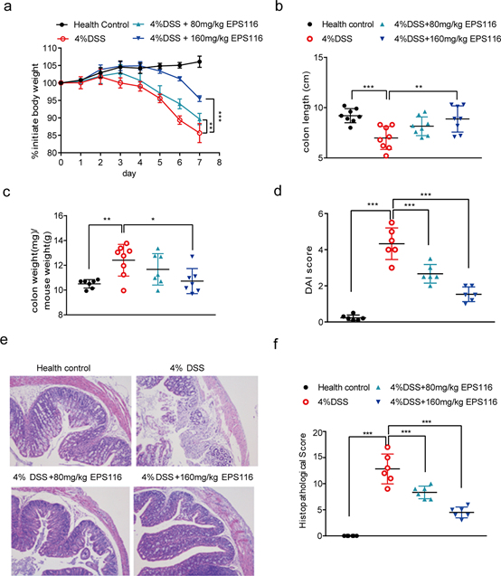 本文探讨了EPS116在调节结肠黏膜屏障中的作用和分子机制。动物和组织切片染色实验表明,EPS116可以减轻DSS诱导的小鼠结肠炎症的程度(包括体重减轻,粪便便血、腹泻、结肠的变短和结肠组织切片评分等参数)。