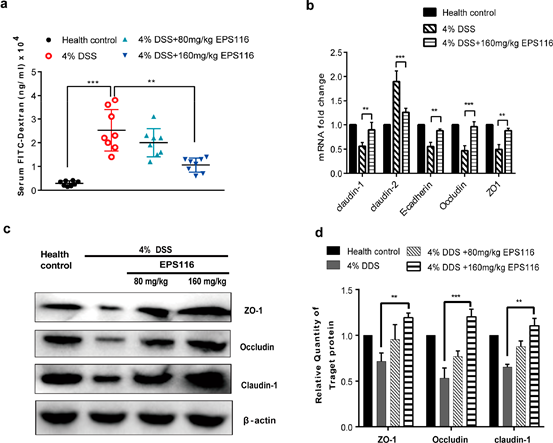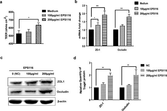 体外细胞实验表明,EPS116可以降低单层Caco-2细胞的通透性,并上调紧密连接蛋白Occludin和ZO-1的表达。