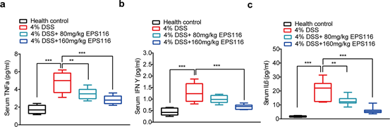 DSS处理导致小鼠血清中促炎细胞因子TNF-α,IFN-γ和IL-6水平的显著增加,而EPS116的摄取降低了它们的表达水平。