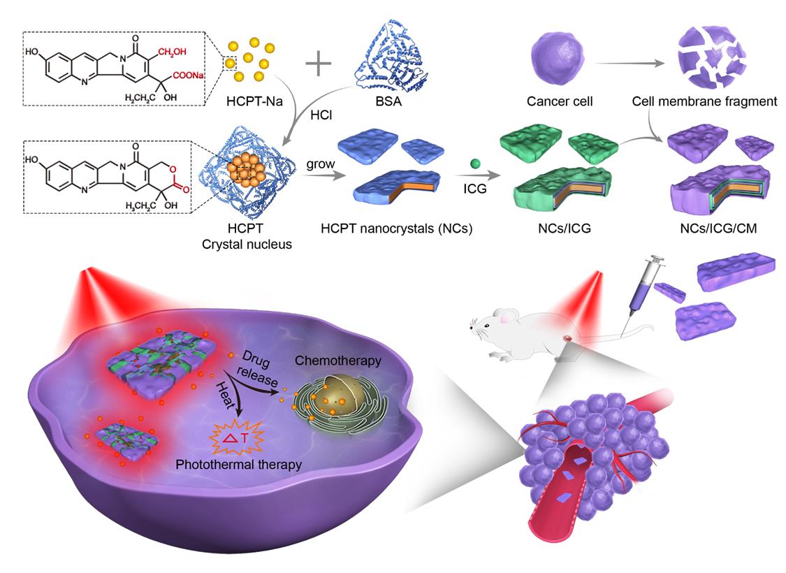 受到临床上10-HCPT经过静脉注射进入体内后容易与血清蛋白结合这一特性的启发,中国科学院过程工程研究所生化工程国家重点实验室马光辉研究员团队提出在10-HCPT的碱性体系中引入血清白蛋白,将其作为软模板,在羧酸盐形式10-HCPT向内酯环形式10-HCPT转化的过程中调节10-HCPT晶体的缓慢生长,进而得到粒径很小的10-HCPT纳米晶体。以此为基础,该课题组首先制备了平均粒径约为200 nm的10-HCPT纳米晶体,随后利用纳米晶体上的血清白蛋白与光敏剂吲哚菁绿之间的分子间作用力,在纳米晶体表面吸附上吲哚菁绿;并在此基础上,通过物理挤压的方式,获得了包覆肿瘤细胞膜且装载吲哚菁绿的仿生10-HCPT纳米晶体。实验结果表明,所构建的仿生10-HCPT纳米晶体借助表面包覆的肿瘤细胞膜,在体内的循环时间显著延长,肿瘤的同源靶向能力明显增强,并且在激光照射下,其中的吲哚菁绿能够产生高热效应,促进纳米晶体中10-HCPT分子的快速释放,进而在高热效应和化疗药物的综合作用下展现了理想的抗肿瘤及抗肿瘤转移效果。