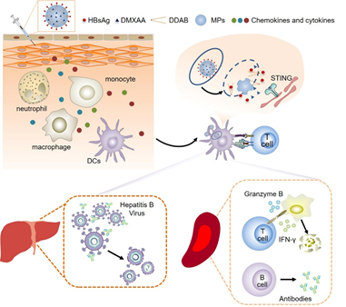 在本研究中,向PLA微球中引入DDAB,使微球荷正电,进一步装载STING刺激剂DMXAA,分别构建DDAB-PLA(DP)和DDAB-PLA-DMXAA(DP-D)微球。与未添加刺激剂的DP微球相比,DP-D微球相应信号通路表达提高。微球吸附HBsAg(吸附率80%以上)后得到微球疫苗制剂。微球疫苗制剂可促进注射部位炎症因子和趋化因子的表达,招募免疫细胞,被树突状细胞(DCs)摄取后可通过质子泵效应逃逸出溶酶体,促进DMXAA释放到细胞质中,与位于胞质中的STING结合,引起下游反应。