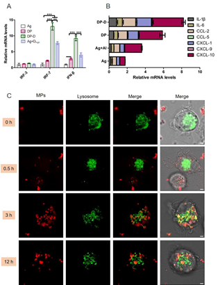图2 A) BMDCs胞内IRF-3/7和IFN-β的mRNA表达水平,B) 注射部位细胞因子和趋化因子mRNA表达水平,C) DP微球在BMDCs中的胞内转运共聚焦图(其中红色为尼罗红标记的微球,绿色为Lysotracker Green标记的溶酶体)
