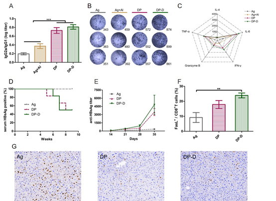 图3 动物免疫实验结果。A-C) 健康鼠结果:A) HBsAg特异性IgG2a/IgG1抗体的比值,B) 产生IFN-γ的脾细胞斑点,C) 脾细胞上清中的细胞因子雷达图;D-G) HBV模型鼠结果:D) 血清中HBsAg表达水平,E) 血清中HBsAg特异性抗体IgG,F) CD8+ T细胞的杀伤性标志FasL表达,G) 肝脏中HBcAg表达,其中蓝色为细胞核、褐色为HBcAg