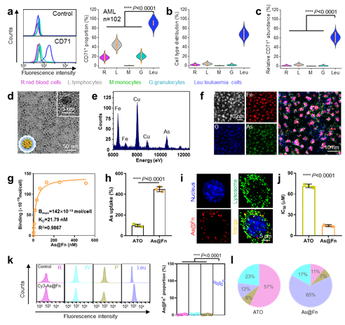 图1:白血病细胞CD71表达、As@Fn的构建和靶向性分析:(a)白血病患者骨髓中各细胞群CD71表达阳性率;(b)各细胞群比例;(c)各细胞群C71表达丰度;(d)As@Fn透射电镜图;(e)As@Fn能谱图;(f)As@Fn球差电镜图;(g)As@Fn和白血病细胞特异性结合曲线;(h)As@Fn和ATO的白血病细胞内吞比较;(i)As@Fn的胞内定位;(j)As@Fn和ATO对于白血病细胞的IC50比较;(k)As@Fn体内靶向白血病细胞分析;(l)As@Fn和ATO的体内分布比较