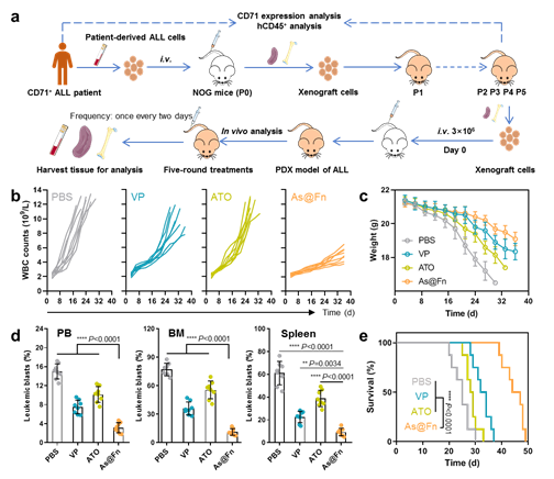 图2:As@Fn在病人来源白血病异种移植模型上的疗效:(a)白血病PDX模型构建及药效分析示意图;(b)不同治疗组小鼠白细胞变化曲线;(c)不同治疗组小鼠体重变化曲线;(d)不同治疗组小鼠外周血(PB)、骨髓(BM)和脾脏中白血病细胞的比例;(e)不同治疗组小鼠的生存曲线