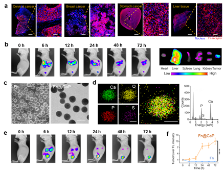 图 1 肝脏对铁蛋白的截留效应、Fn@CaP的构建及其靶向性分析。(a)肿瘤和肝脏组织铁蛋白受体表达水平的免疫荧光分析(标尺:左图2 mm;右图100 µm);(b)Fn的体内分布成像;(c)Fn和Fn@CaP的TEM图像(标尺:30 nm);(d)Fn@CaP的元素分布(标尺:10 nm)和能谱分析;(e)Fn@CaP的体内分布成像;(f)Fn和Fn@CaP的肿瘤和肝脏荧光比值变化曲线