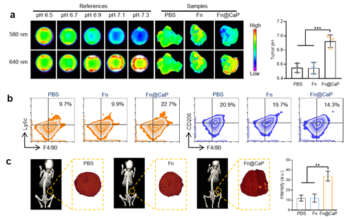 当Fn@CaP到达实体肿瘤后,还可以显著调节肿瘤微环境。首先,肿瘤细胞代谢产生的乳酸使得磷酸钙外壳溶解,这个过程会消耗氢离子,进而有效改善肿瘤酸性微环境。其次,酸性微环境的改善可以促进M2型巨噬细胞向M1型极化,从而改善肿瘤免疫抑制微环境。另外,磷酸钙外壳溶解产生的大量钙离子还可以进一步促进肿瘤的钙化。