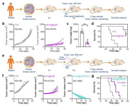 图 3 Fn@CaP按需装载不同药物后在PDX模型中的药效分析。(a)内腔装载三价砷的Fn@CaP用于PDX治疗的药效评价示意图;(b)小鼠肿瘤生长曲线;(c)小鼠肿瘤重量统计;(d)小鼠生存曲线;(e)外壳装载ICG且内腔装载三价砷的Fn@CaP用于难治型PDX治疗的药效评价示意图;(f)小鼠肿瘤生长曲线;(g)小鼠生存曲线