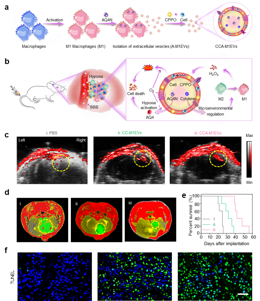 图2 基于M1EVs的仿生剂型构建方案、抗肿瘤机制及PDX疗效:a. 仿生剂型的构建示意图;b. 仿生剂型在GBM模型中的累积及免疫调节、化学激发动力学和乏氧触发化疗的协同作用示意图;c. 基于光声成像分析仿生剂型在PDX小鼠GBM病灶中的累积;d. 各组PDX小鼠的抑瘤效果(20天核磁成像);e. 各组PDX小鼠的生存期分析;f. 各组PDX小鼠的TUNEL分析(标尺50 µm)
