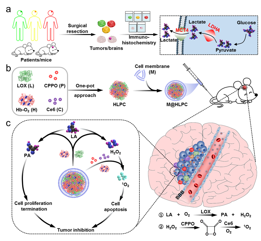 研究团队首先对胶质瘤患者的临床样本和小鼠胶质瘤模型进行了免疫组化的分析,发现胶质瘤恶性程度越高,肿瘤组织内乳酸代谢越强。据此,研究团队提出了代谢调控结合靶向协同治疗的GBM高效治疗新思路。具体而言,将血红蛋白(H)、乳酸氧化酶(L)、草酸双酯(CPPO)(P)、光敏剂Ce6(C)通过一步法制备成HLPC颗粒后,进行GBM细胞膜镀层,构建仿生M@HLPC剂型。静脉注射后,M@HLPC通过整合素和粘附蛋白间特异性识别介导的转胞吞途径跨越BBB,进一步通过膜表面CD44等分子同源靶向GBM。在此基础上,M@HLPC催化肿瘤内高表达的乳酸产生丙酮酸和双氧水,一方面丙酮酸通过降低组蛋白表达来阻滞细胞周期,进而抑制肿瘤细胞增殖;另一方面双氧水与CPPO反应释放化学能激发光敏剂Ce6,产生单线态氧杀伤肿瘤细胞。通过上述代谢调控和协同机制可以高效杀伤GBM细胞。
