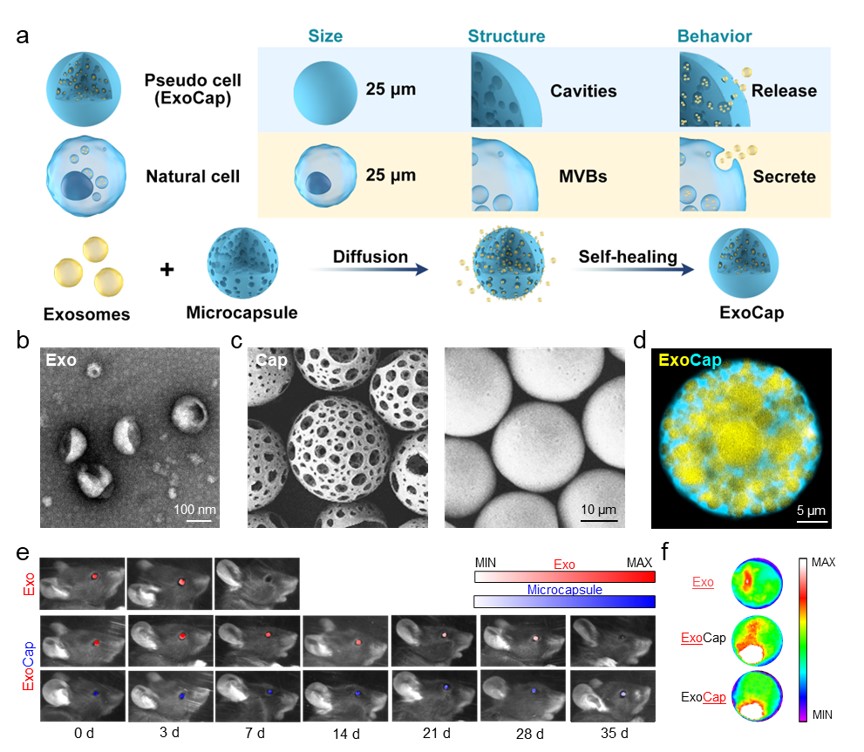 图1 ExoCap设计理念、构建方法及其眼内滞留和分布:a. ExoCap设计理念及构建过程示意图;b. Exo的透射电子显微镜图像;c. 自愈合大孔微球愈合前(左)后(右)扫描电子显微镜图像;d. ExoCap的共聚焦显微镜图像;e. ExoCap在小鼠眼内滞留情况;f. ExoCap在小鼠眼内分布情况