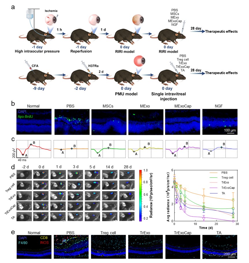 鉴于该体系构建的通用性和灵活性,可以根据治疗需求负载不同细胞来源的外泌体。小鼠视网膜缺血再灌注损伤(RIRI)模型证明,通过装载间充质干细胞外泌体(MExo)可以有效地阻止视网膜细胞凋亡,效果显著优于神经生长因子(NGF)治疗方案。另外,小鼠和食蟹猴致敏分枝杆菌性葡萄膜炎(PMU)模型证明,通过装载调节性T细胞外泌体(TrExo)可以抑制眼内炎症,效果显著优于现有的糖皮质激素(TA)治疗方案。