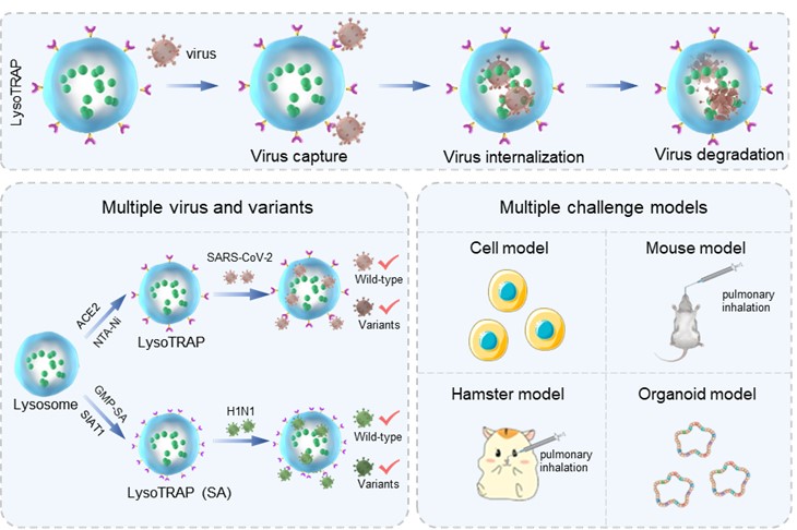 当前的病毒治疗药物存在因病毒变异导致效果欠佳的风险。近日,过程工程所生物药制备与递送重点实验室受病毒入胞感染和胞内病毒清除现象启发,设计并创建了溶酶体“陷阱”(lysoTRAP)新策略。该lysoTRAP能高效捕获、内化和降解病毒,在细胞、小鼠、仓鼠和人源肺类器官上,对新冠病毒、流感病毒及其变异株均取得了优异的病毒清除效果。相关工作于11月23日发表在Nature Communications(DOI:10.1038/s41467-024-54505-6)。